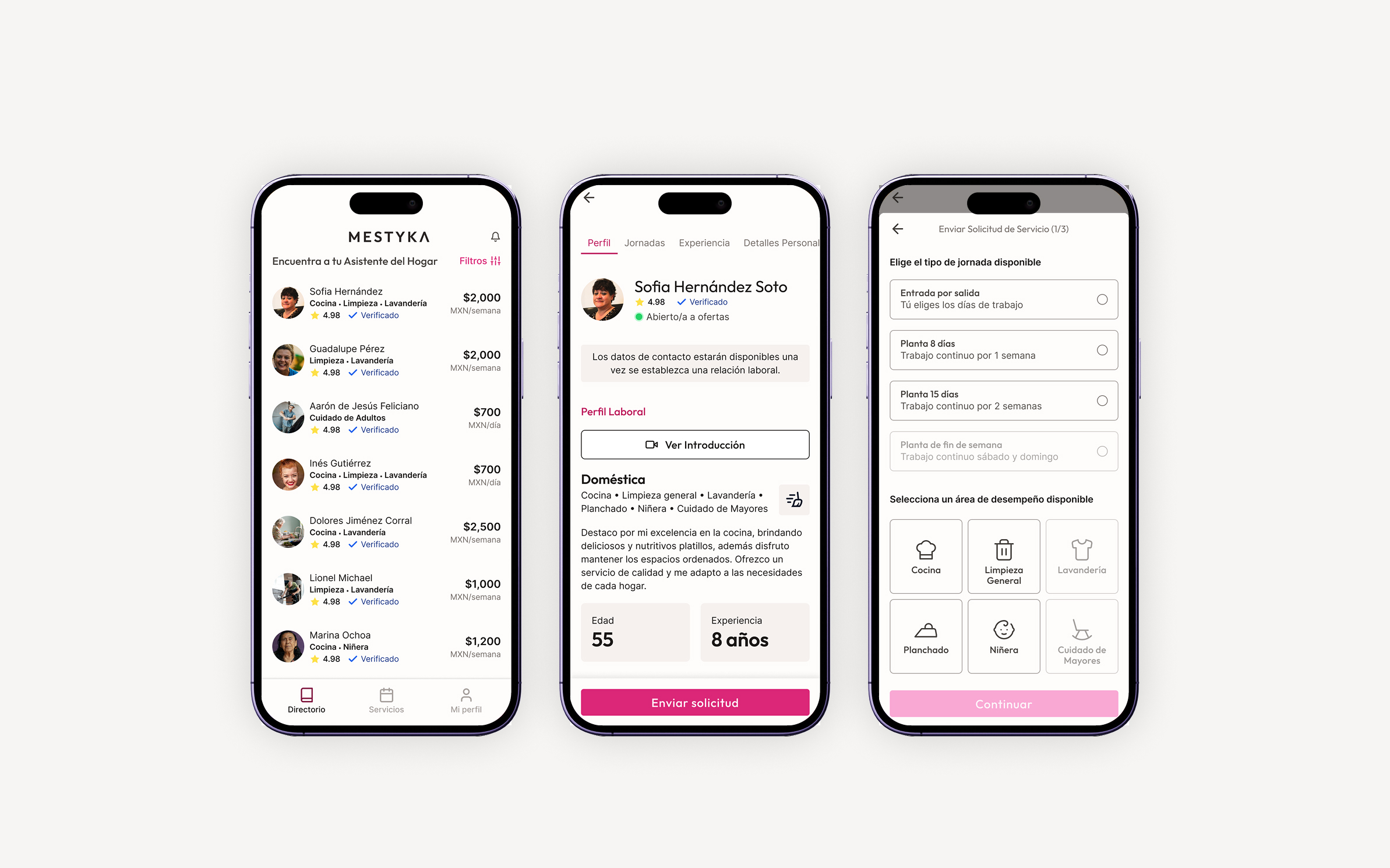 Logic Kernel creó una PWA (Aplicación Web Progresiva) para Mestyka. Esta aplicación permite el registro y gestión de usuarios, la búsqueda de personal, un sistema de contrataciones y un servicio de soporte. Al personal le permite aceptar o rechazar ofertas según sus necesidades, así como gestionar su disponibilidad y tarifas.