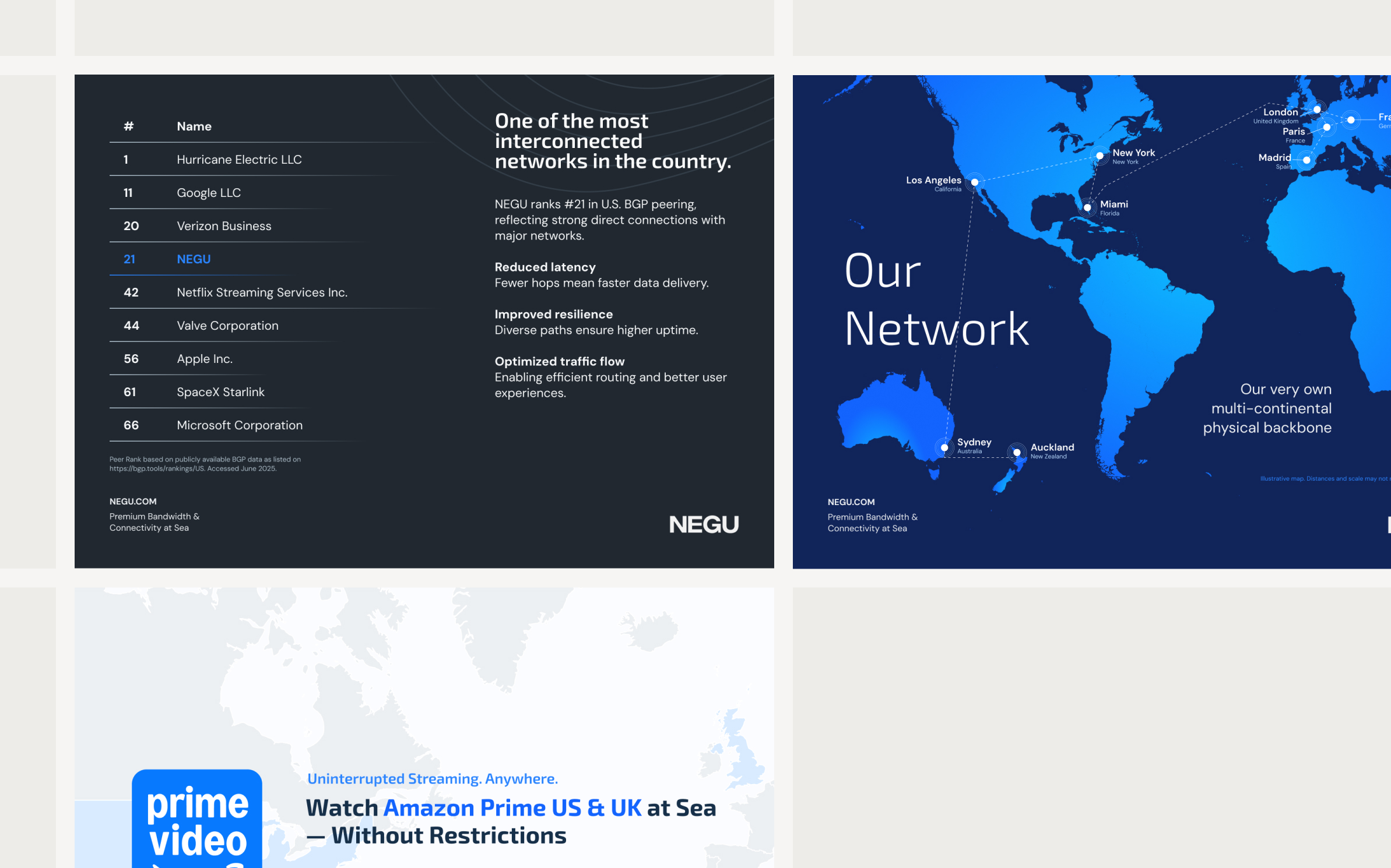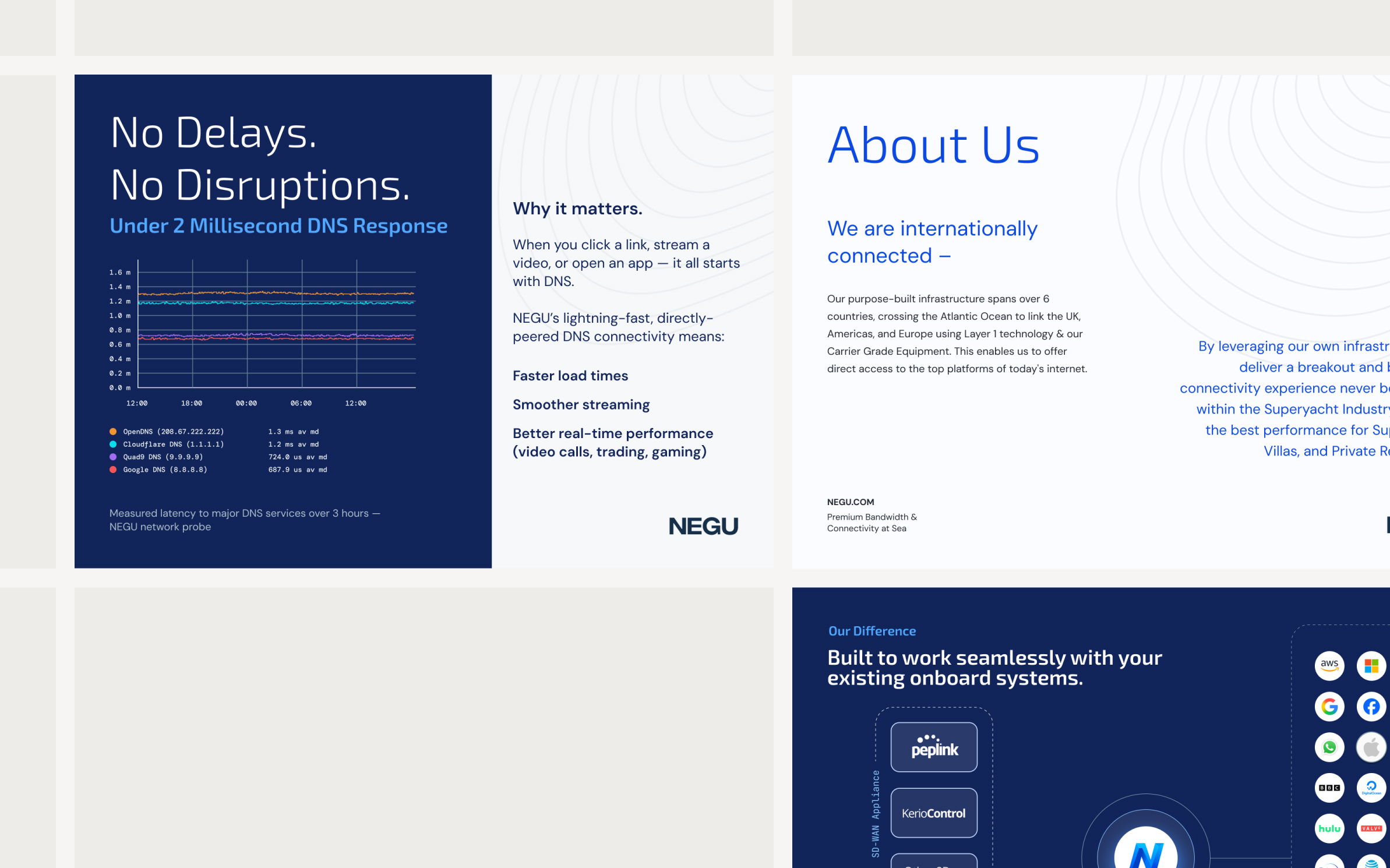 NEGU, una empresa especializada en ofrecer conectividad de alta velocidad y acceso a contenido de streaming desde cualquier parte del mundo —incluso en superyates en mar abierto—, necesitaba un folleto informativo que comunicara de forma clara sus beneficios y ventajas competitivas. El reto consistía en presentar información técnica de manera sencilla y atractiva para audiencias con poco conocimiento en el tema, destacando el alcance de la red de NEGU y su superioridad frente a la competencia. Además, el diseño debía ser lo suficientemente versátil para ser usado tanto en formato impreso como en presentaciones durante reuniones.